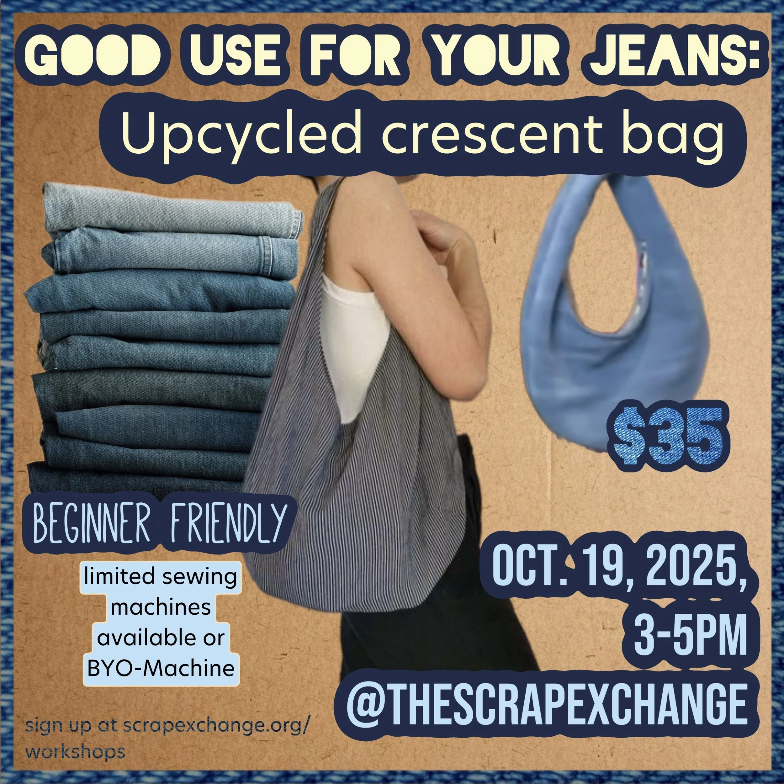 Upcycle your old or damaged jeans to make a purse or tote sized crescent bag. We will use your jeans and Scrap’s upholstery excess to make a cute, spacious bag. BYO-sewing machine or use one from the Scrap. Email me at jadewillowcreatives@gmail.com with any Qs!