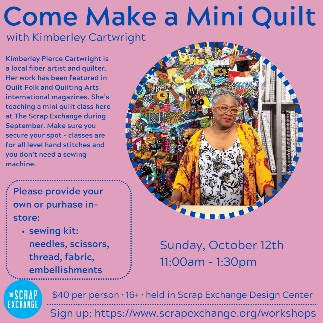 In this workshop participants will use needle and thread to create a scrappy mini quilt. No experience is necessary. Please bring scrap fabric and sharp scissors. Some fabric will be provided. Needles and thread will be provided.