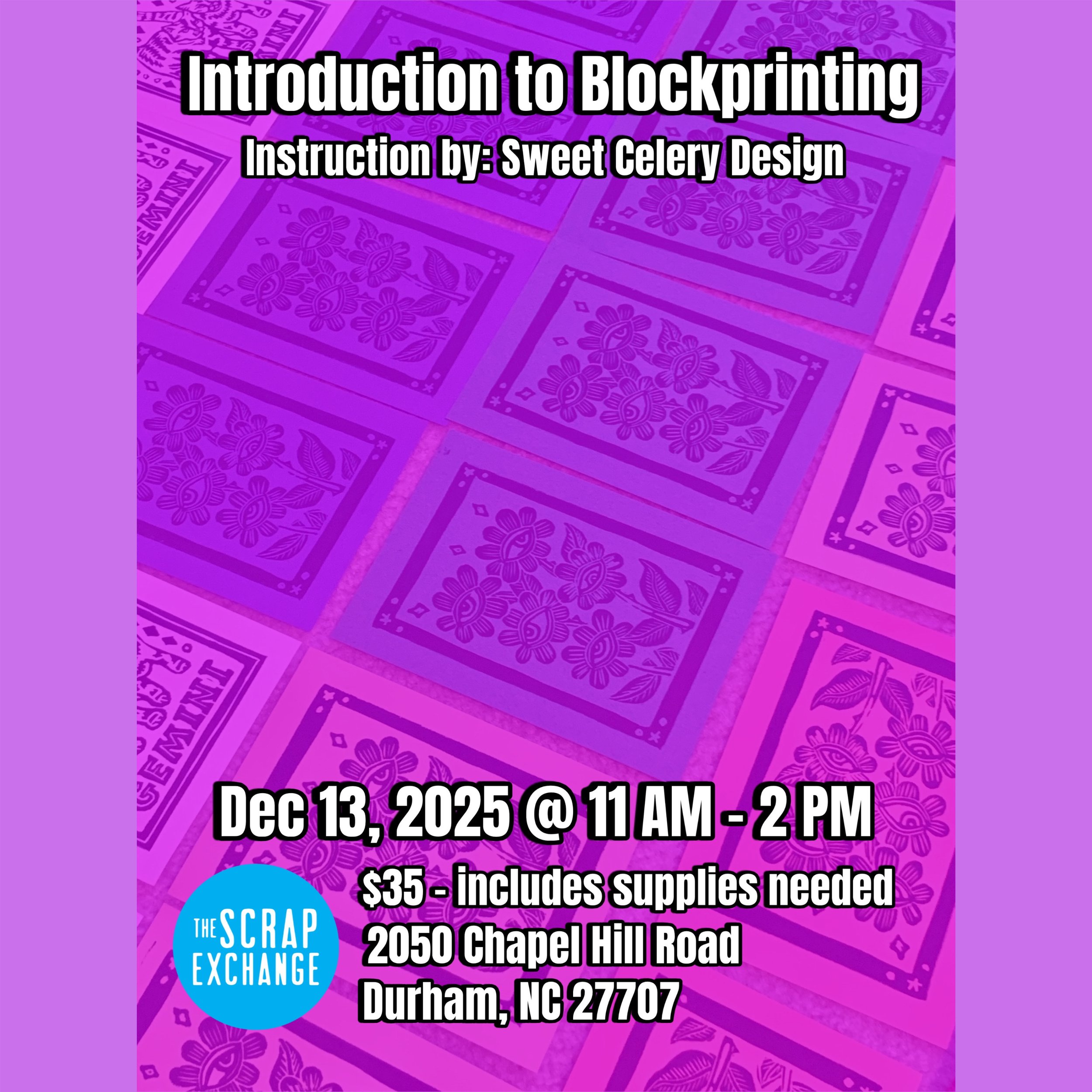 Did you learn about blockprinting in middle or high school? Did you want to practice more? This is the class for you! This is an introductory class to blockprinting where you will learn how to carve your own stamp. This class is perfect for beginners and those who have previously learned blockprinting skills but want to get back into it. Participants will create a stamp of their own design and will print on fabric or paper with use of the instructor's tools. Participants will leave the class with the following items: their own newly carved stamp, their own upcycled item, and test print(s) of their stamp. This is a special holiday evening edition of my normal stamp workshop at Scrap, but there is no pressure to create a holiday-themed stamp.